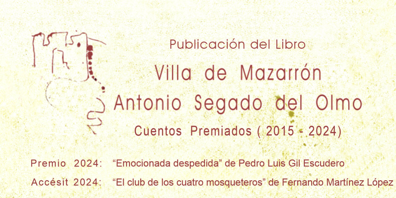 Jul162025ConcursosDestacado Villa de Mazarrón Antonio Segado del Olmo Cuentos Premiados ( 2015 – 2024 ) Conexión con la publicación de todos los trabajos publicadosPremio 2024Accésit 2024 Categorías: Concursos, DestacadoPor Jose Maria16 julio 2025 Compartir Share on WhatsAppShare on WhatsApp Share on LinkedInShare on LinkedIn TweetShare on Twitter Share on FacebookShare on Facebook Navegación entre publicacionesAnteriorPublicación anterior:Presentación del libro “Villa de Mazarrón – Antonio Segado del Olmo, Cuentos Premiados (2015-2024)”SiguientePublicación siguiente:Alfonso Goizueta en MazarrónArtículos RelacionadosConvocada la XLII edición del Concurso de Cuentos Villa de Mazarrón – Antonio Segado del Olmo1 diciembre 2025“Escenarios y Representaciones”18 noviembre 2025Visita Guiada en la exposición “Habitar(es). De paisaje y memoria”13 noviembre 2025Inauguración de “Topografía emocional” de Natalia Nomokonova10 noviembre 2025“Habitar(es). Paisaje y memoria”7 noviembre 2025“Topografía emocional”6 noviembre 2025
